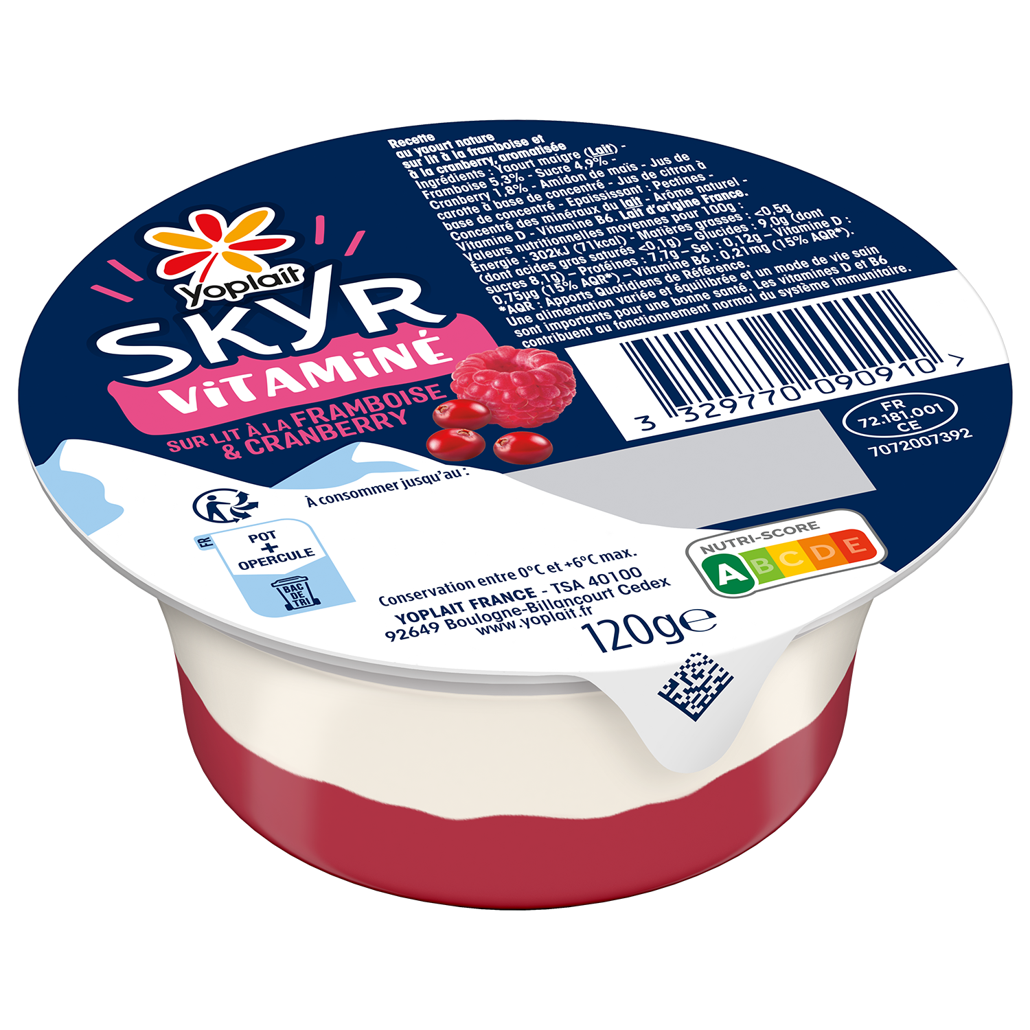 Yaourt maigre (LAIT) – Framboise 5,3% – Sucre 4,9% – Cranberry 1,8% – Amidon de maïs – Jus de carotte à base de concentré – Jus de citron à base de concentré – Concentré des minéraux du LAIT – Epaississant : Pectine – Arôme naturel – Vitamine D – Vitamine B6. LAIT D’ORIGINE FRANCE