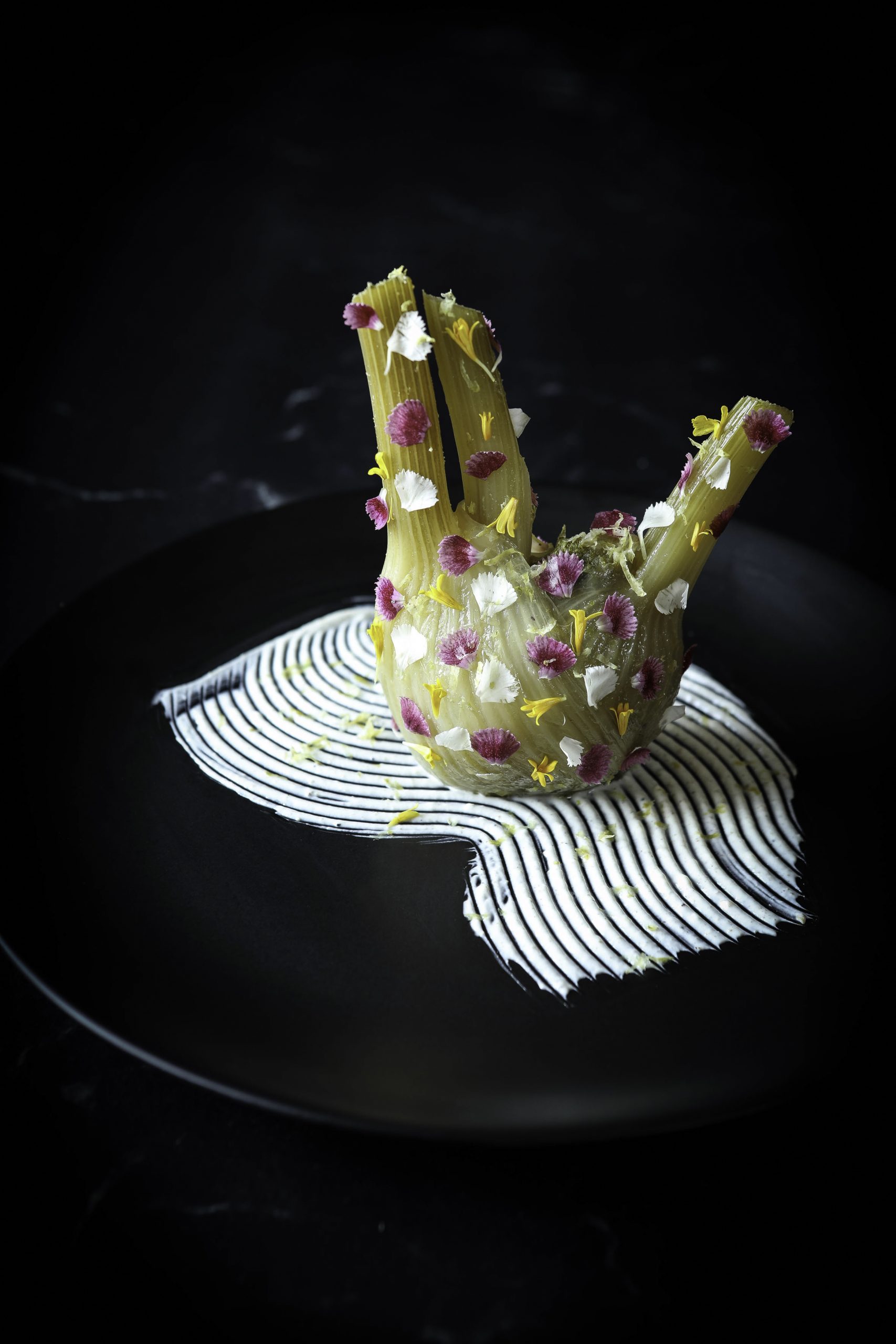 Dresser avec la sauce au fond et les fenouils cuits, tailler des copeaux de fenouil crus à citronner pour la texture.