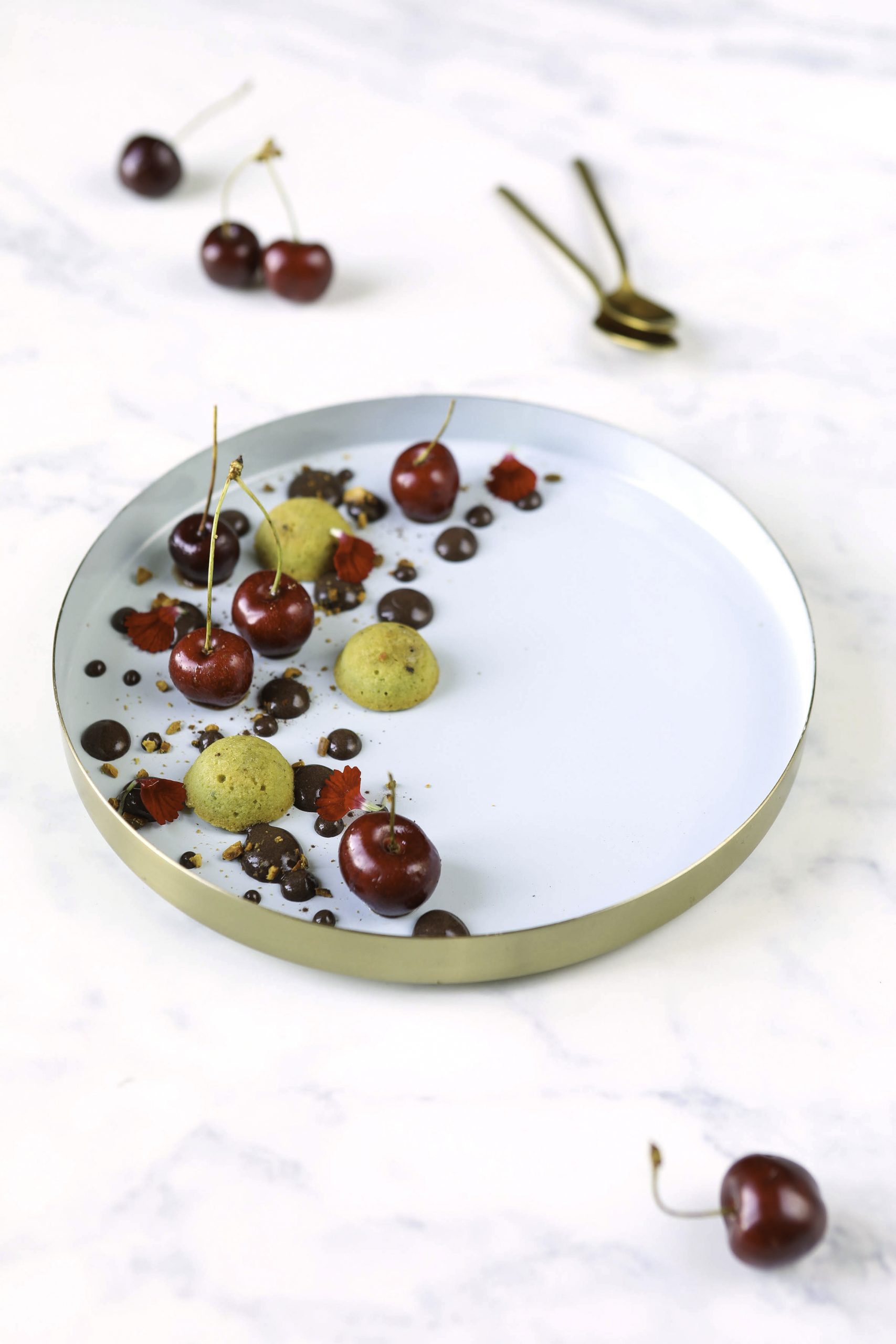 Retirer les noyaux des cerises et mariner avec les autres ingrédients. Confectionner la pâte à financier avec le beurre noisette, cuire à 180°C pour environ 15 minutes.