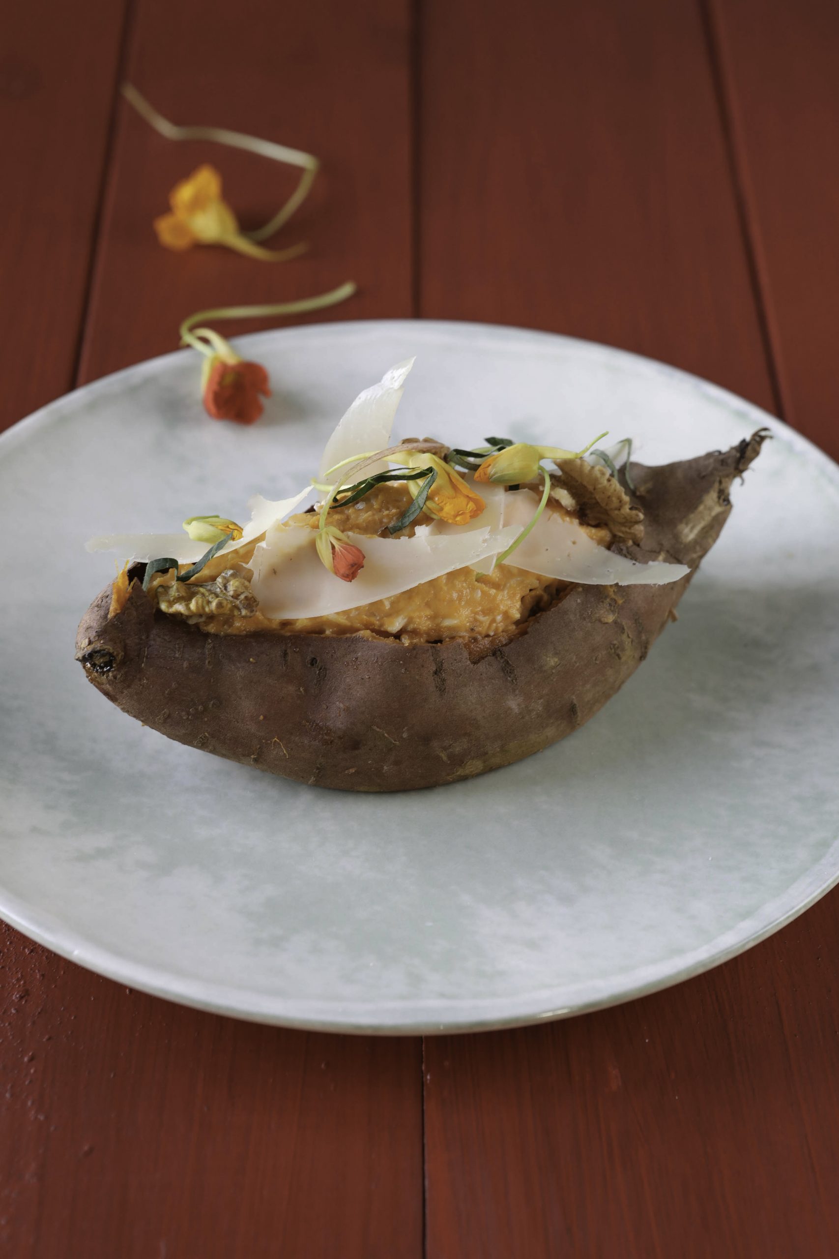 Farcir les peaux des patates douces, ajouter le comté râpé et enfourner 10 mn.