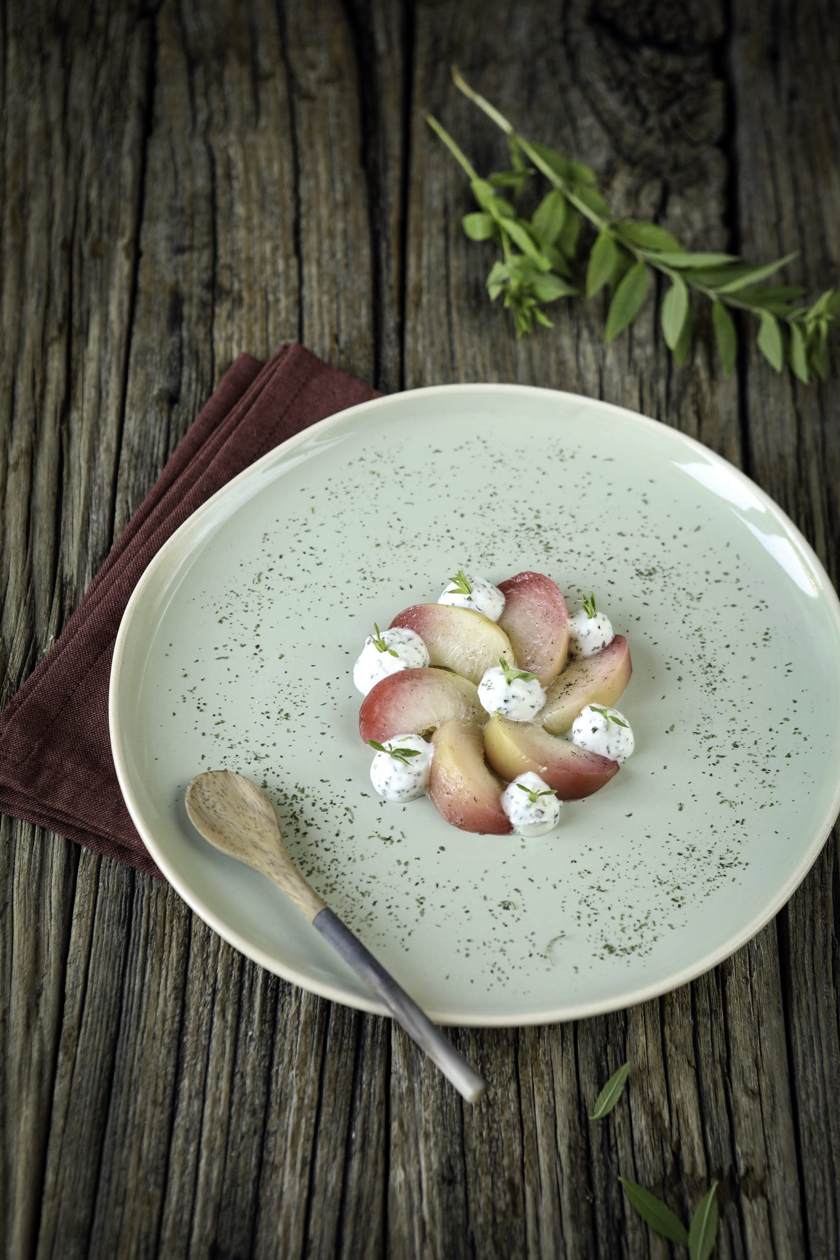 Pour la sauce, mélanger au fromage blanc le sucre, le jus et le zeste de citron jaune, ciseler la verveine. Dans une assiette creuse, disposer la sauce et les morceaux de pêches cuites au sirop. Décorer avec le coulis de pêche de vigne.
