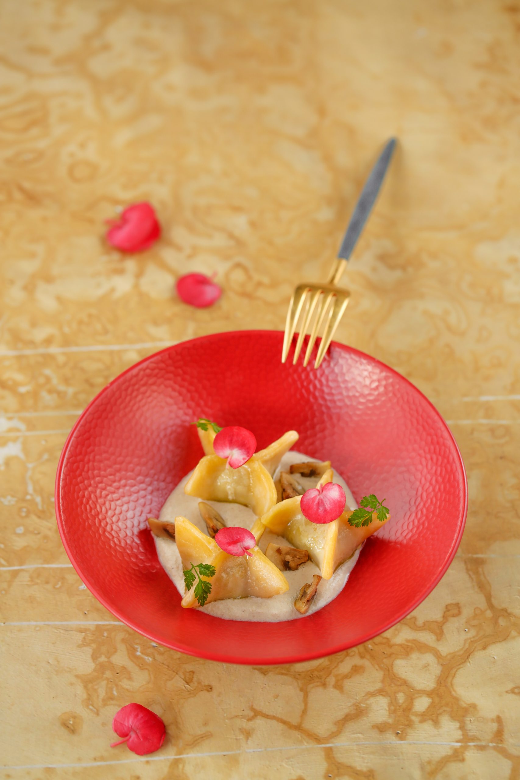Raviole farcie aux champignon de paris sauce fromage blanc échalote vin blanc