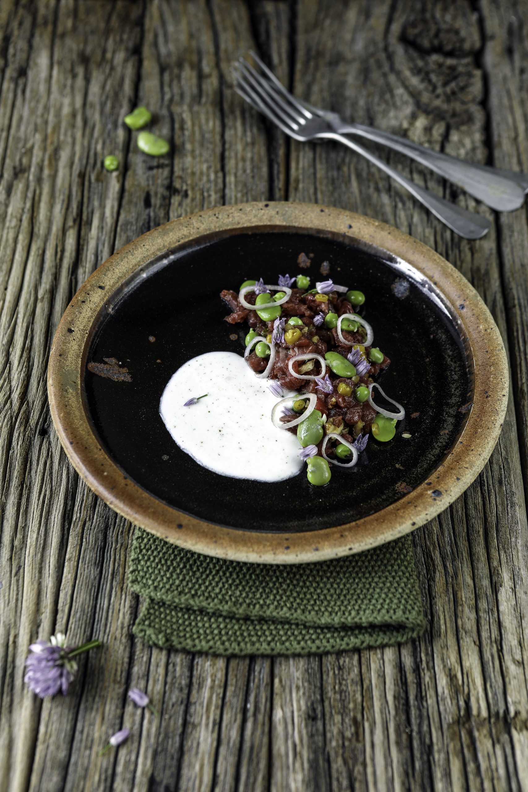 Mélanger le tartare avec l’huile, le condiment et les légumes, ajouter la sauce sur le côté et finir l’assaisonnement.
